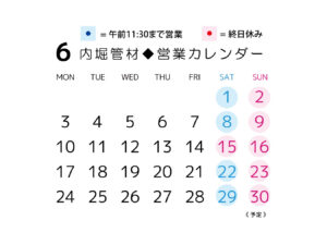 6月の営業カレンダー 6/15㈯は、お休みです。